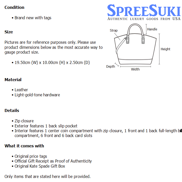All our products are 100% authentic and purchased from Kate Spade stores in USA. We are a reputable registered business in Singapore and it is illegal to sell counterfeit goods in Singapore. This product also comes with a gift receipt which is printed by the Kate Spade store that we purchased the item from. It states the item that we purchased and the Kate Spade store that it was purchased from, proving the authenticity of the item. Buy with confidence.