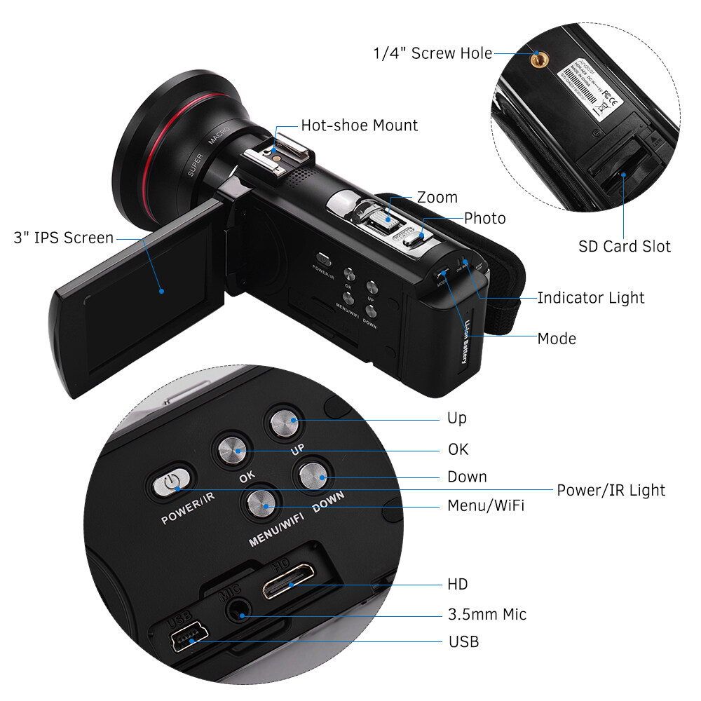 WiFi, video and photo can be controlled and shared by downloading APP "C-Video" on smartphone; Hot shoe mount for connecting external microphone or