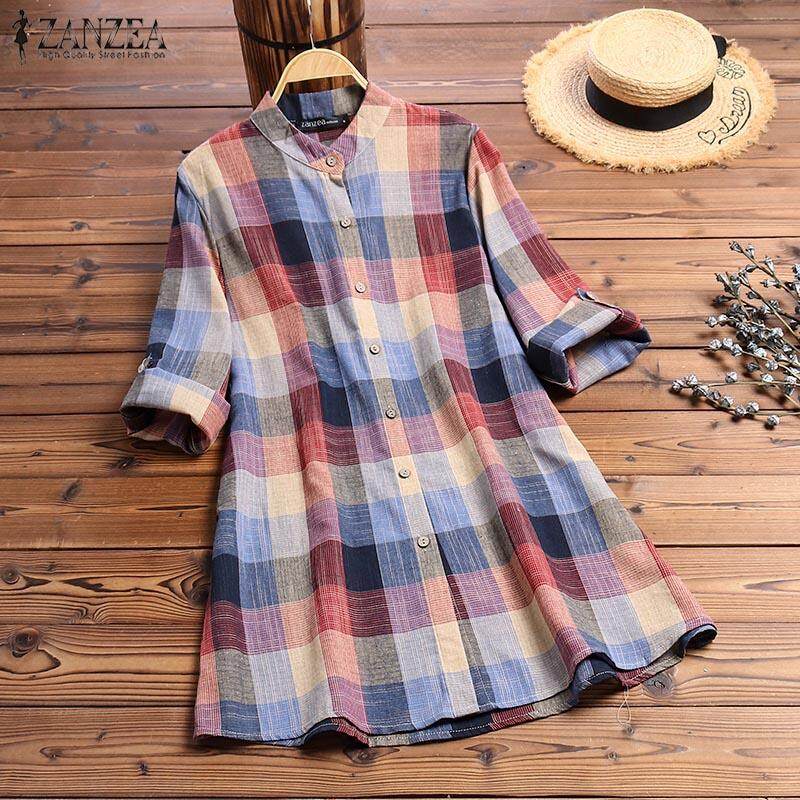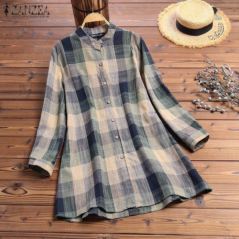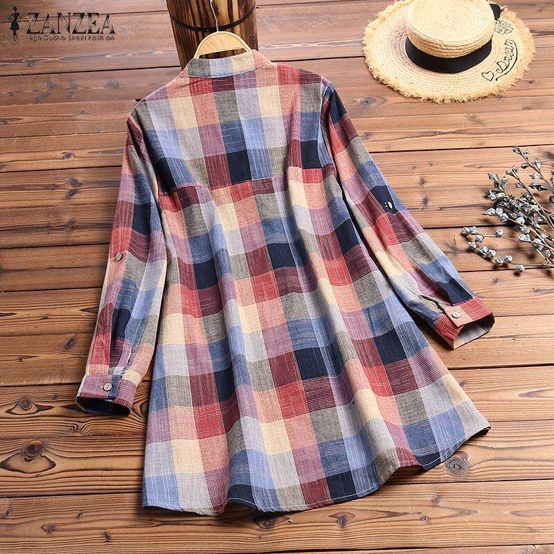 Muangee Women Buttons Down Long Sleeve Plaid Check Shirt Tops Stand Collar Blouse ZANZEA