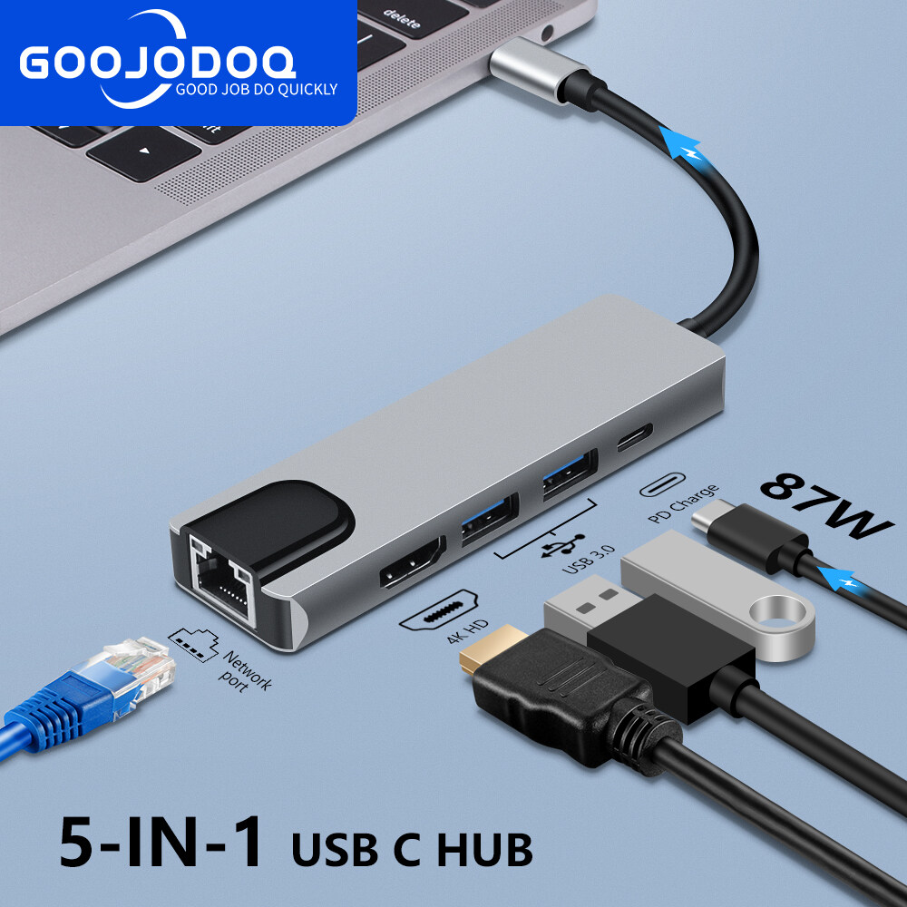 GOOJODOQ 5 in 1 USB C Hub Hdmi Gigabit Ethernet Adapter for Macbook Pro, Type C to Rj45 Lan Adapter with USB-C Charger Port