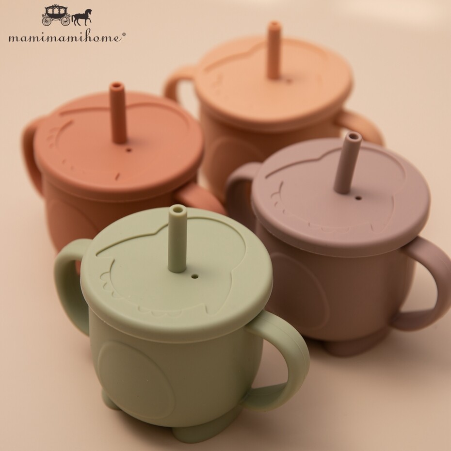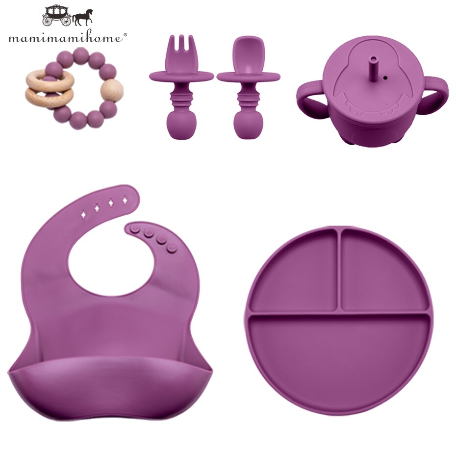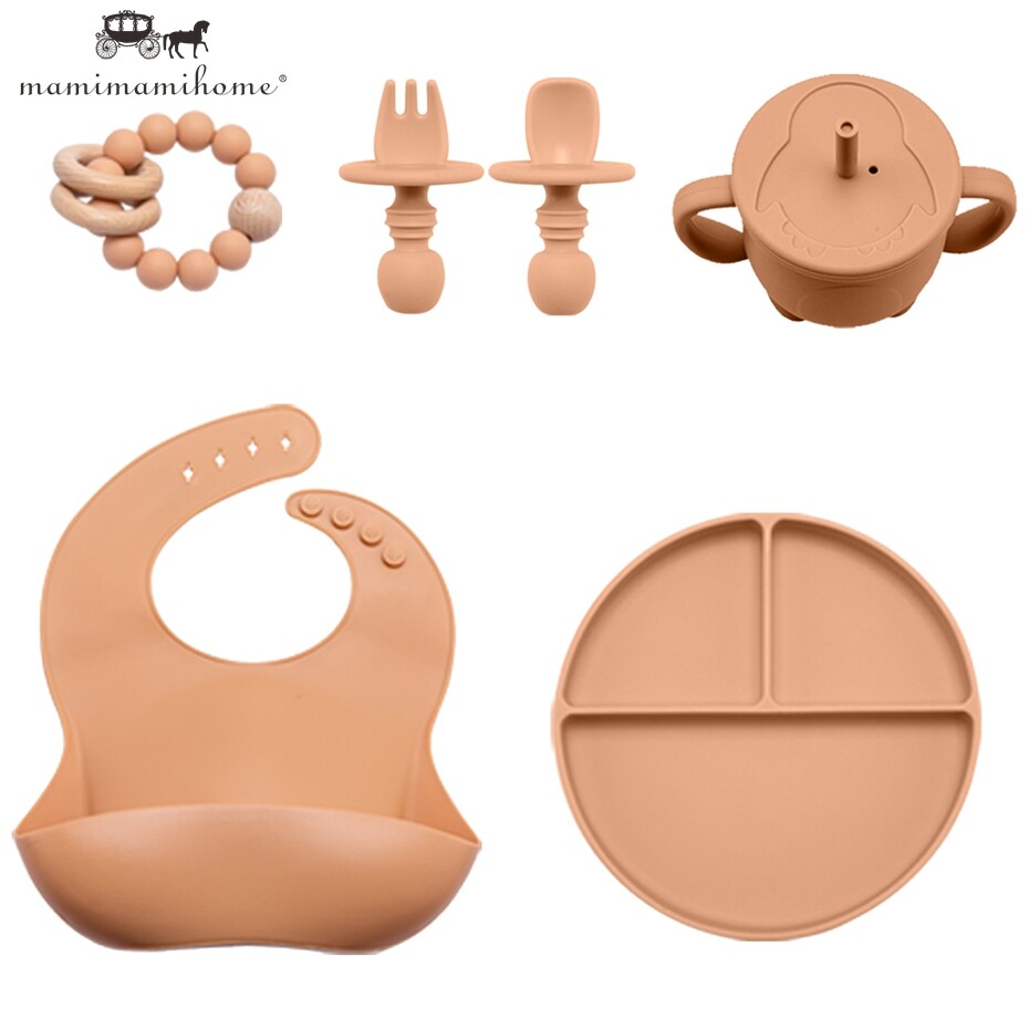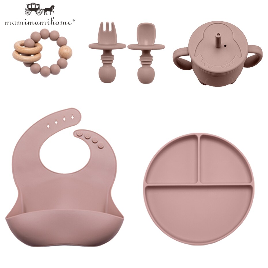 Mamimami Home Baby Feeding Meal Set 5pcs 100% Silicone Anti-fall Suction Plate,Spoon & Fork,Sippy Cup,Soft Bib