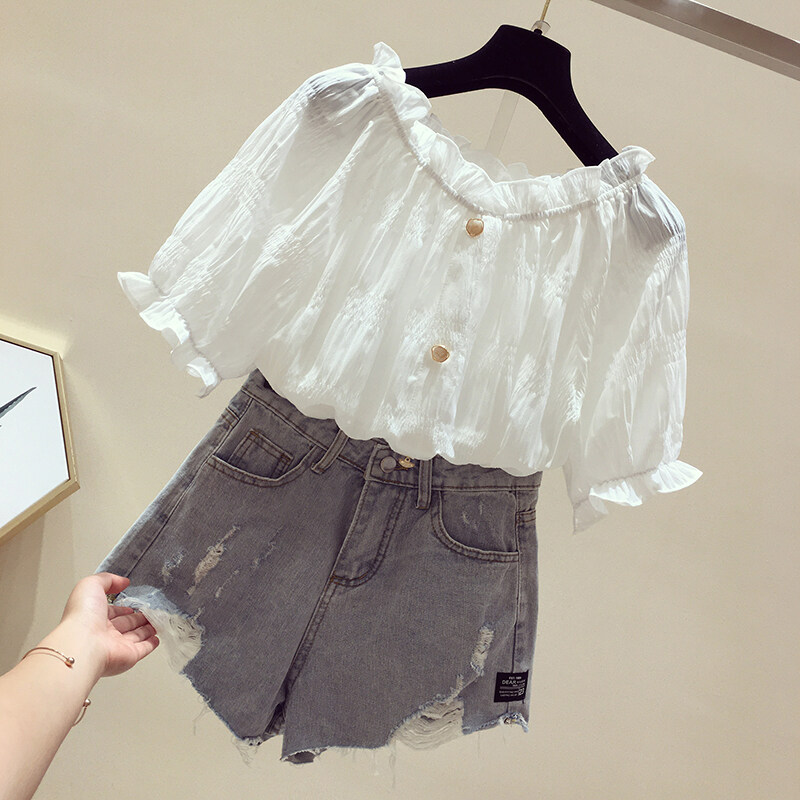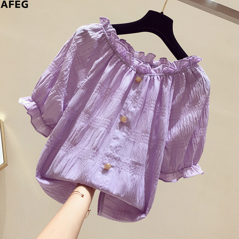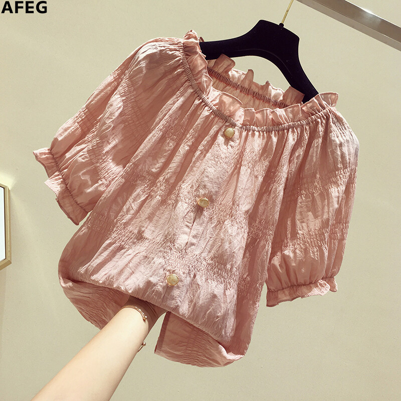 AFEG solid color new Korean version of the word collar fashion casual all-match short-sleeved blouse for women
