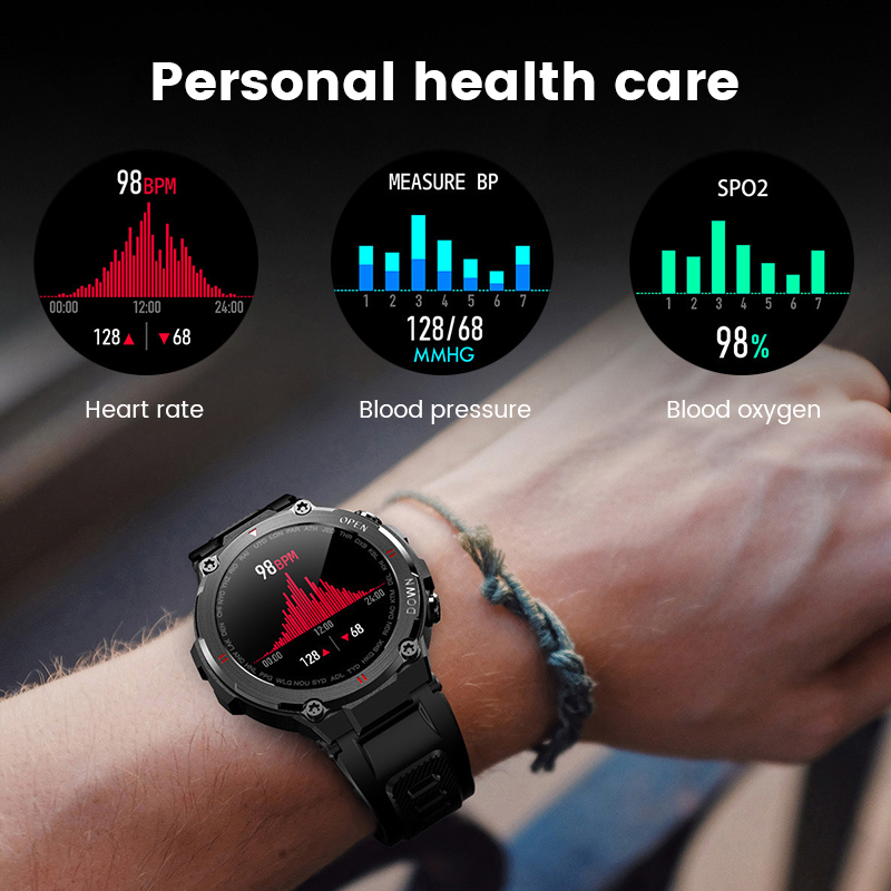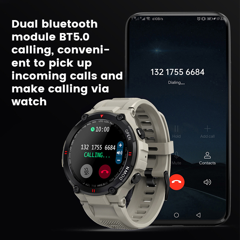 Product description:Model: K22 Smart WatchChip: Realtek8762CScreen: 1.28 inch IPS color Full touch screenOperation method: Full screen touch + buttonBluetooth version: Dual Bluetooth BET4.0+5.0Battery capacity: 400mAhCharging method: Magnetic adsorption chargingStandby time: about 30 dayUsage time: about 5~7 day(Use time is determined by frequency of use. Frequent use will reduce use time)Waterproof level: IP65 waterproof (Note: Please do not use it when swimming and showering)Compatible system: iOS 8.0 version above and Android 4.4 version aboveAPP name: Da FitSupport language: English,Japanese,German,French,Spanish,Arabic,Russian,Ukrainian,Portuguese