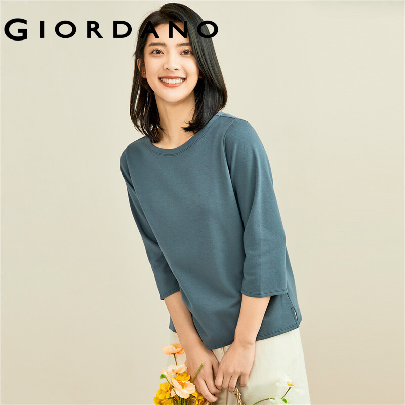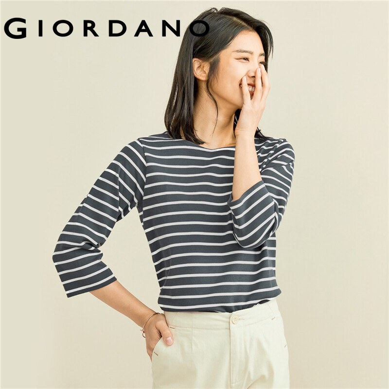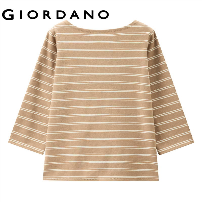GIORDANO Women T-Shirts Simple Solid Color Comfy Smooth Boat Neck T-Shirts 3/4 Sleeves Stripe Design Solid Color Tee 05321629