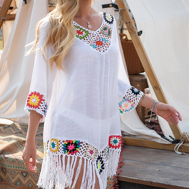 Lovely Beach Cover Up for Women Fashion Sexy Women Hollow Big V-Neck Short Sleeves Irregular Fringe Bikini Beach Outfits