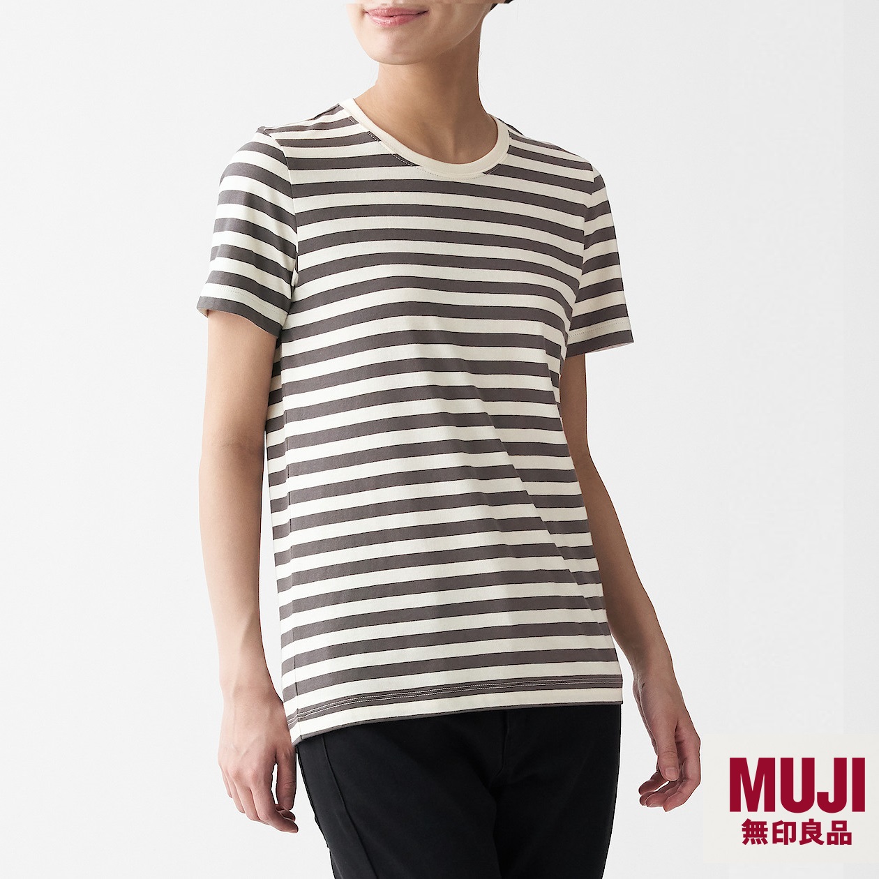 MUJI Ladies Indian Cotton Jersey Stitch Border Crew Neck Short Sleeve T-Shirt