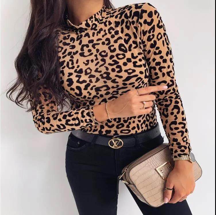 EDQRDQ Women's Leopard Print Long Sleeve High Neck T-Shirt Basic Solid Slim Cheetah Shirts Fitted Tee Top