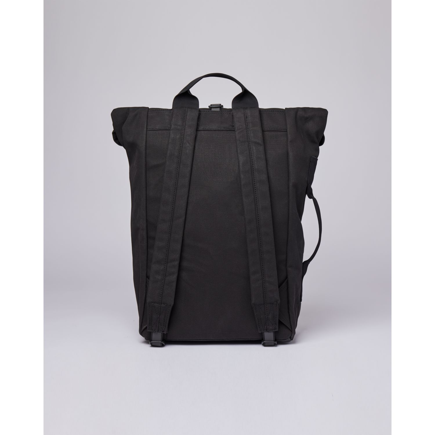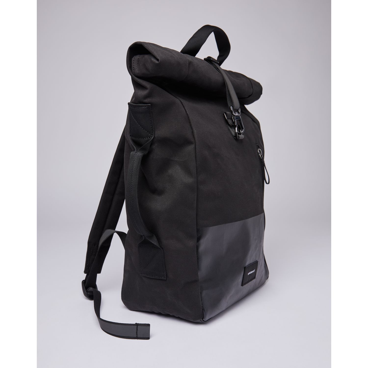 Rolltop backpack made from organic cotton and recycled polyester. A 100% vegan bag featuring a 15" laptop compartment and can carry 18 L. Fill the bag up to the rolltop and it can fit 21 L. The bottom and front of the bag is treated with a silk print coating for extra water resistance. FEATURES