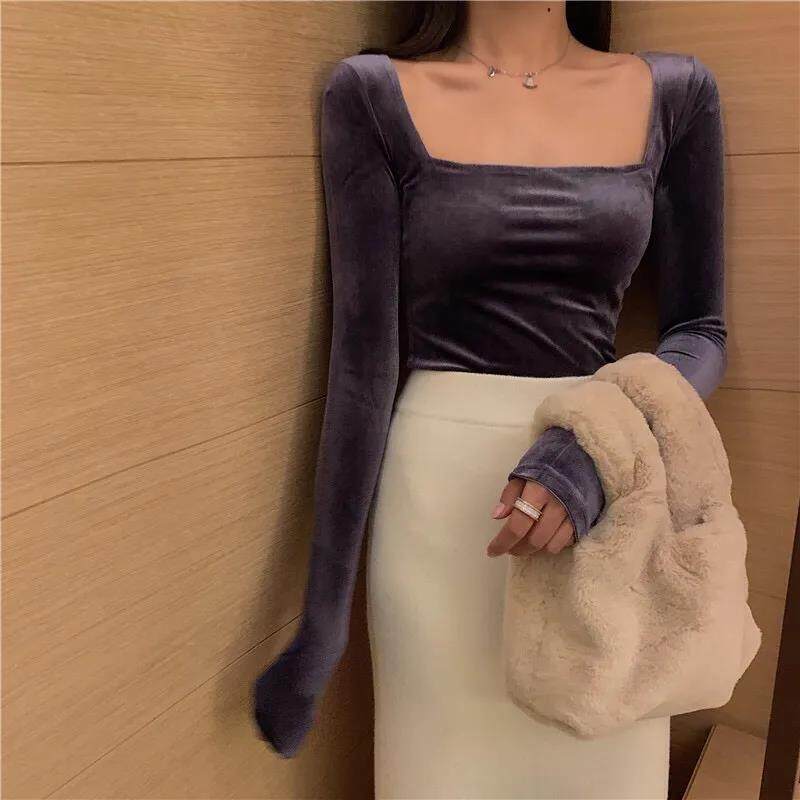 EDQRDQ Womens Vintage Velvet Long Sleeve Square Neck T Shirts Tops Tees