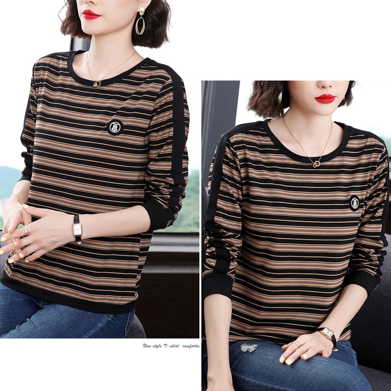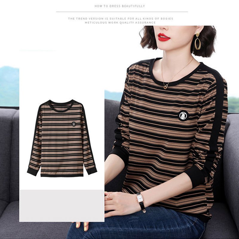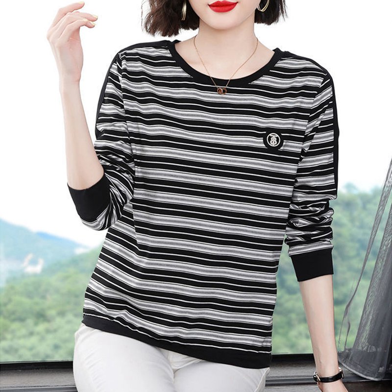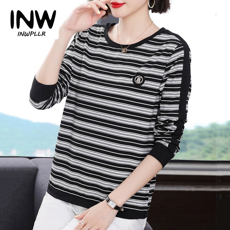 INWPLLR Spring Women's T-shirts Stripe Long Sleeve Tops All-match O-Neck Large Size Tops Tee Female
