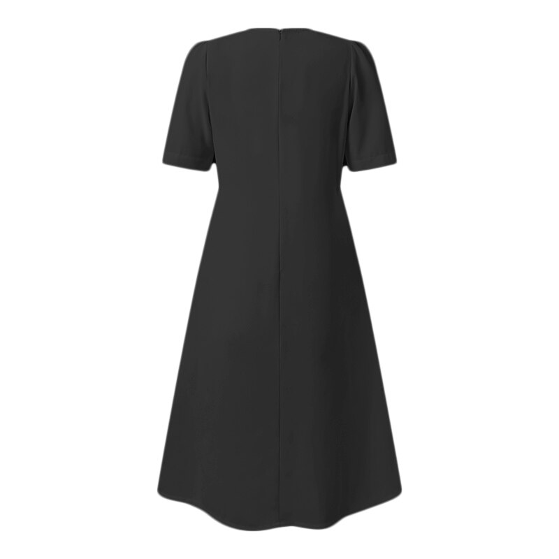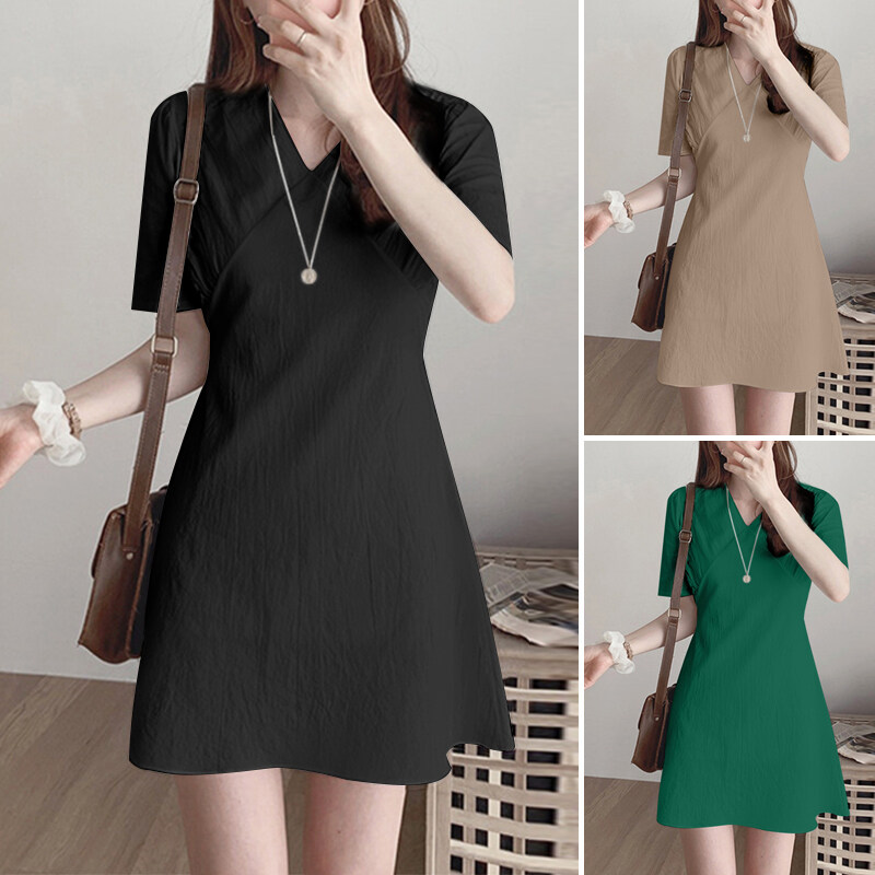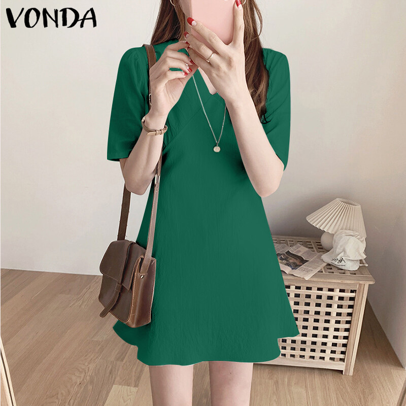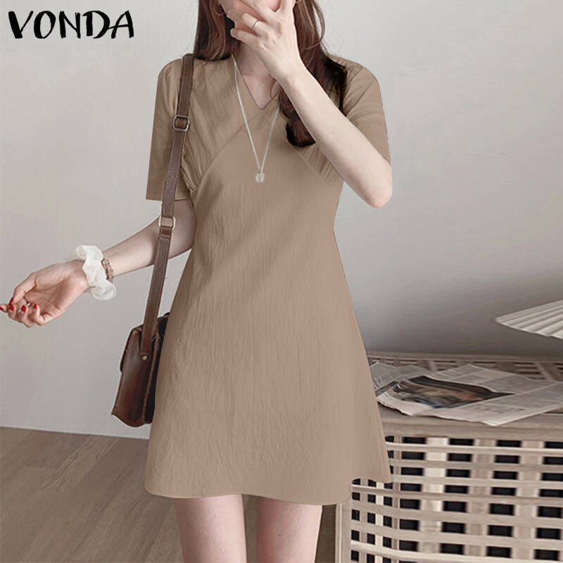 VONDA Women Casual Short Sleeve V Neck Holiday Plain Dress Fashion Pleated Party Short Dresses (Korean Causal)