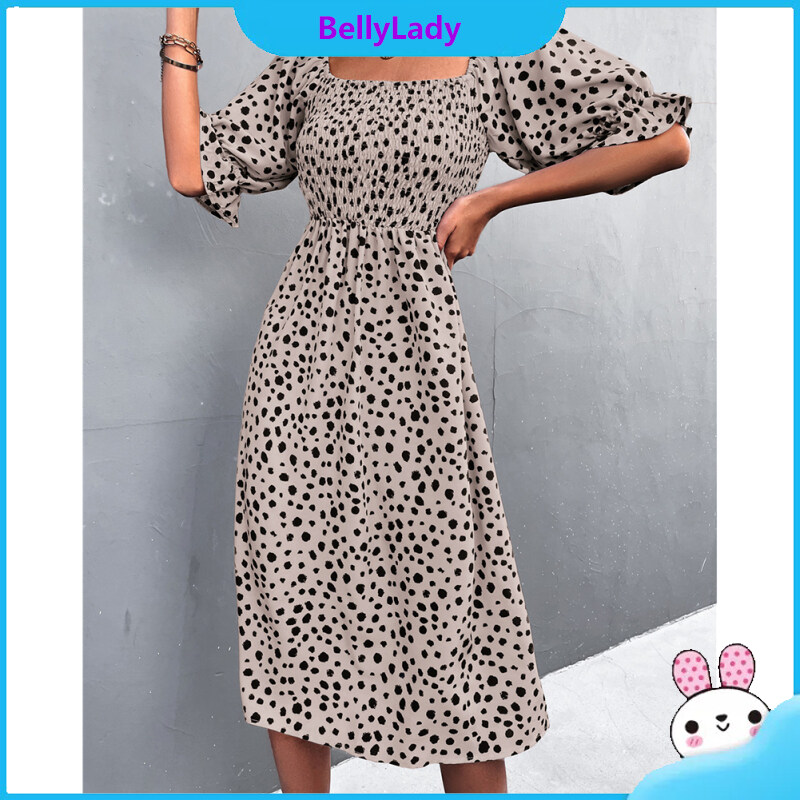 Women Retro Square Collar Dress Polka Dot Printing Puff Sleeve A-line Skirt High Waist Half Sleeves Dress
