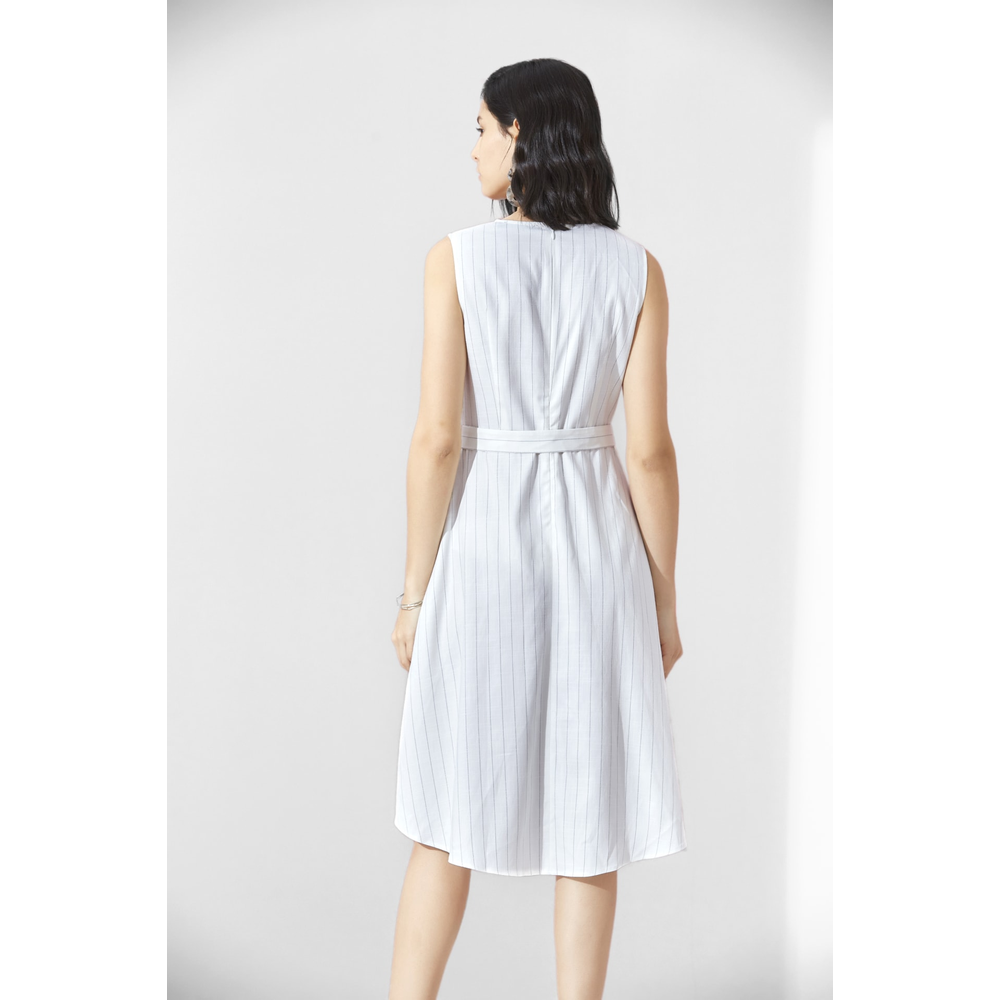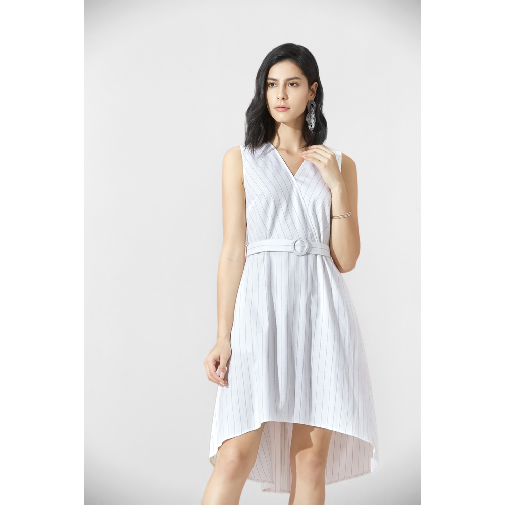 G2000 Women Linen Look Pinstripe Irregular Hem Dress With Belt
