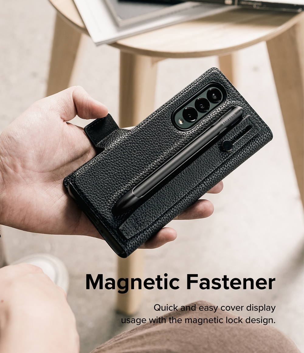 • Artisan-crafted, all-around coverage folio-type case for the Galaxy Z Fold 4 with a comfy built-in hand strap and stick-on S Pen holder