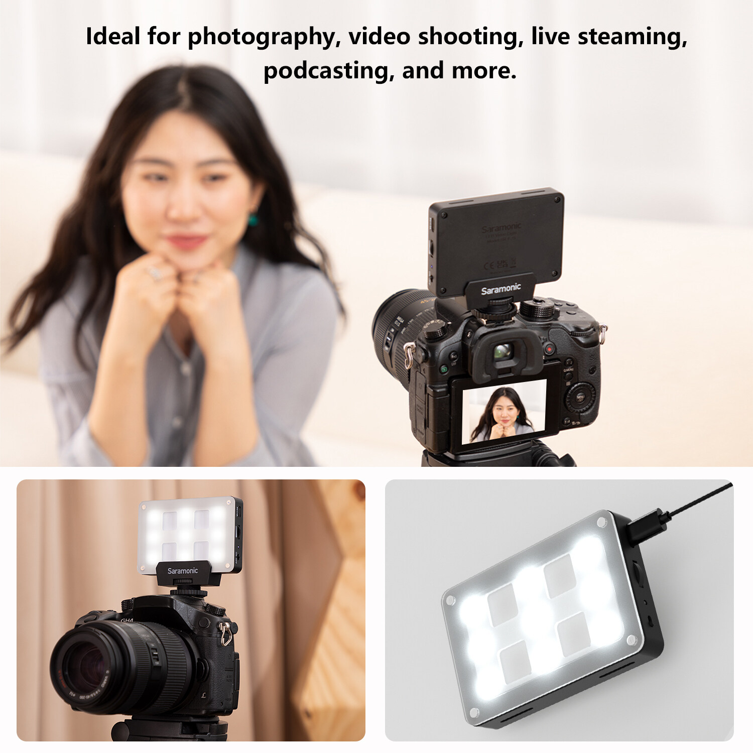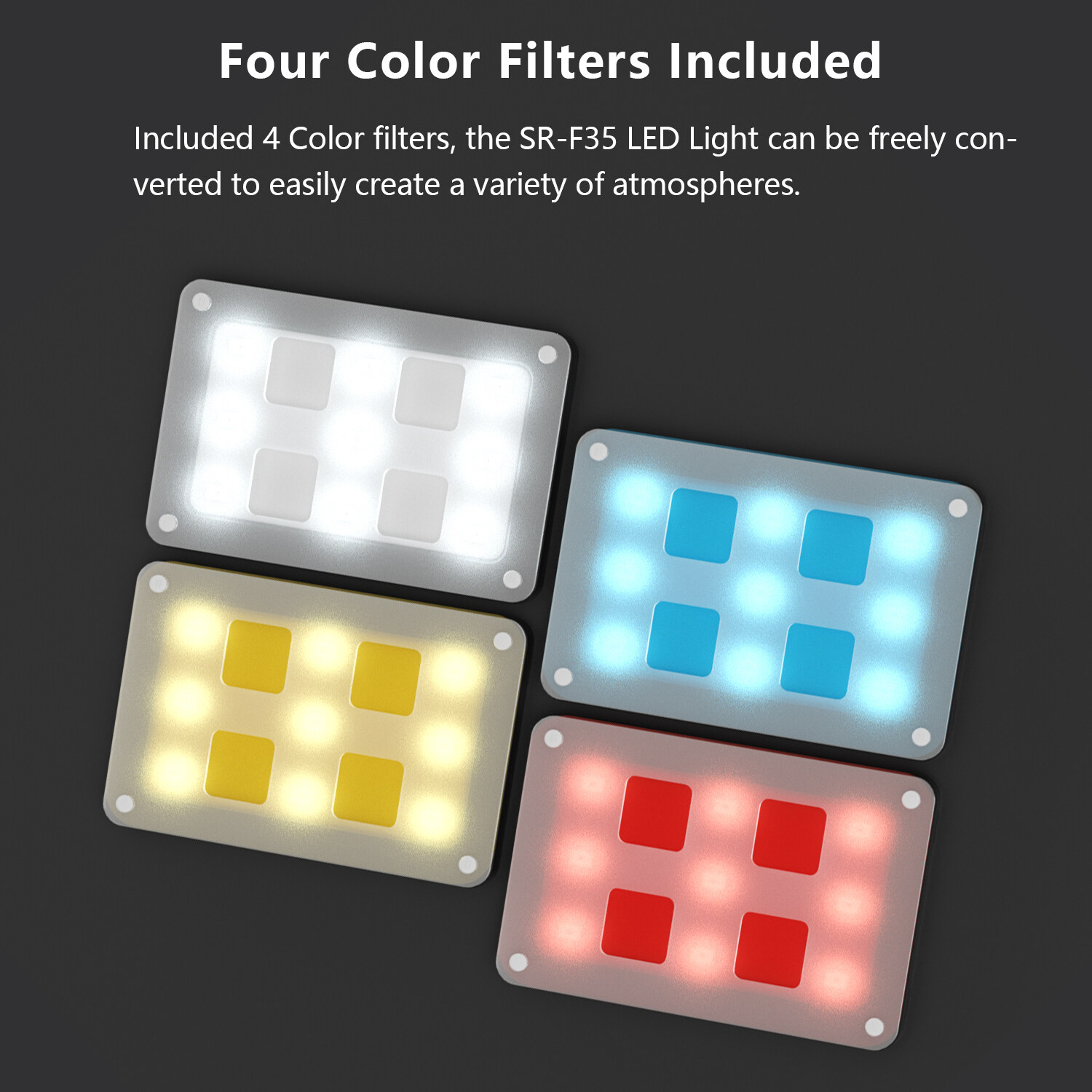 Four color filters are included, providing users with flexibility to create colorful lighting effects for different shooting scenarios. The SR-F35 LED light is ideal for photography, video shooting, live streaming, podcasting, and more.