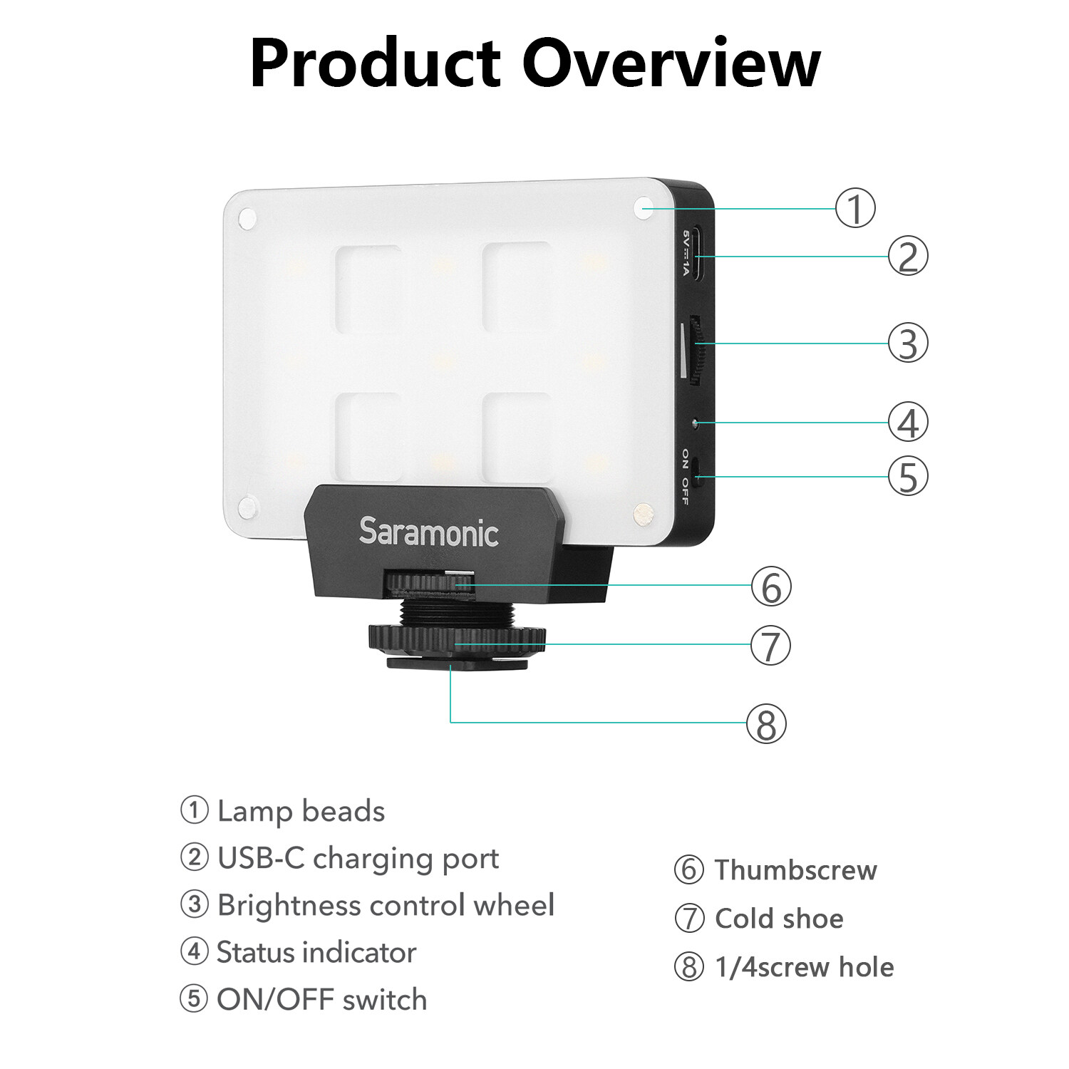 Saramonic SR-F35 is an ultracompact and lightweight pocket LED light. It features 9 LEDs and 5500+K color temperature. With a brightness control wheel, you can easily adjust brightness to suit different shooting conditions. Built-in rechargeable lithium battery provides up to 9.5-hour runtime at minimum brightness and can be charged via the USB-C charging port.