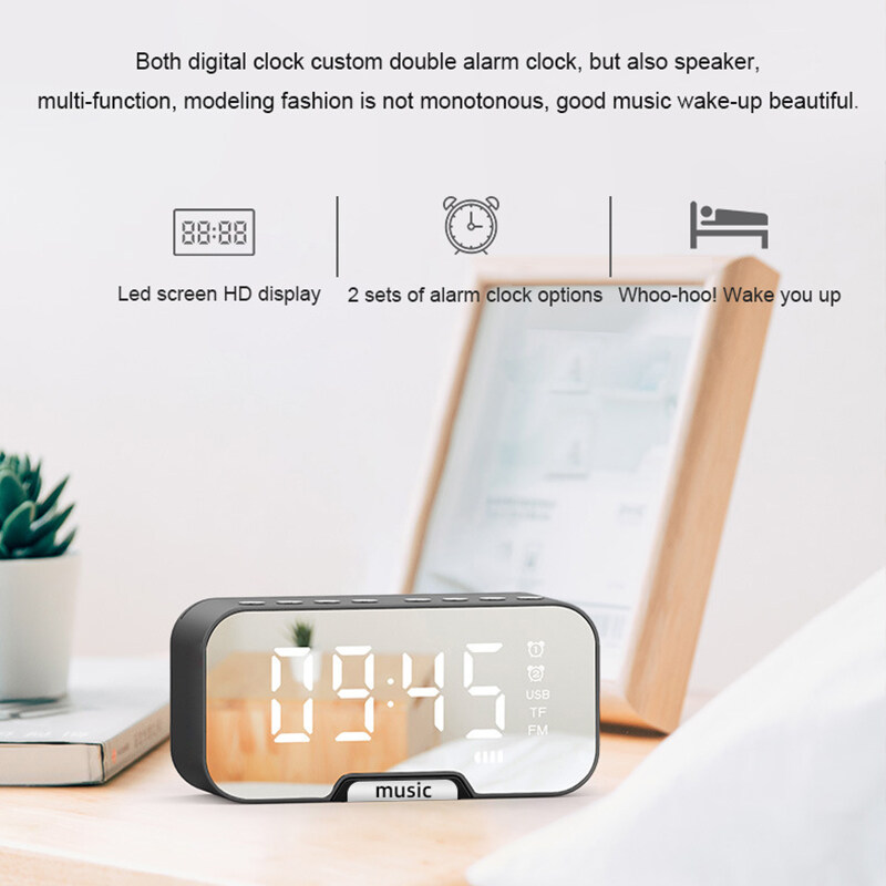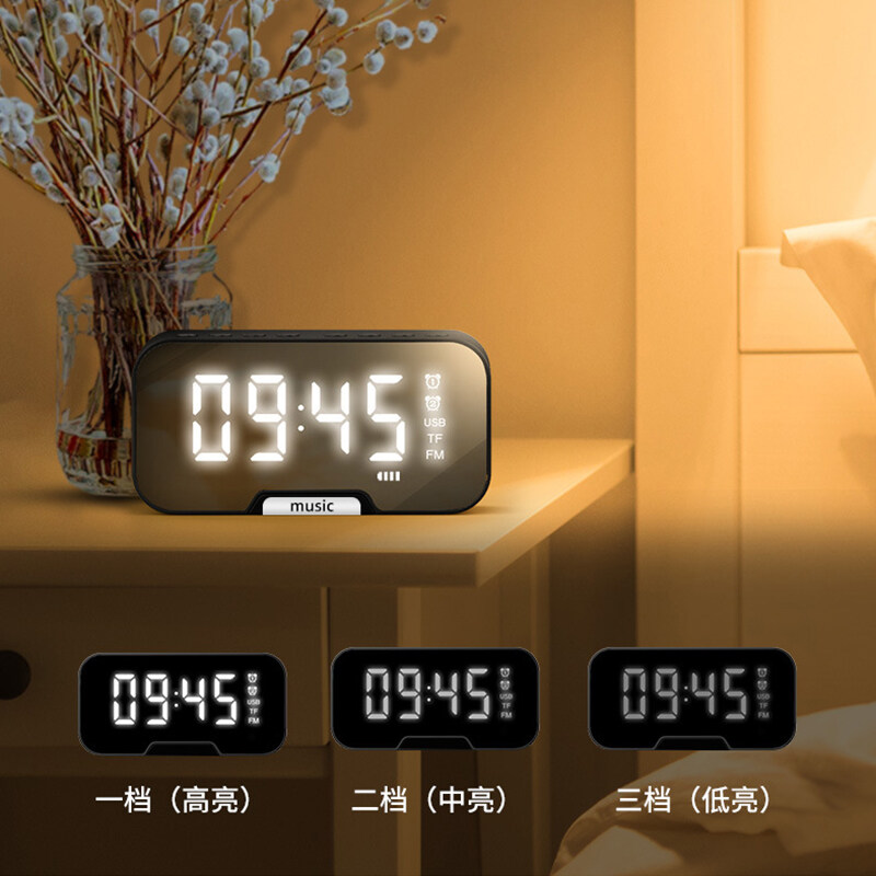 The multifunctional bluetooth speaker support bluetooth, AUX, and TF card, and with FM, alarm clock, makeup mirror, phone holder, night light and collection reminder function.