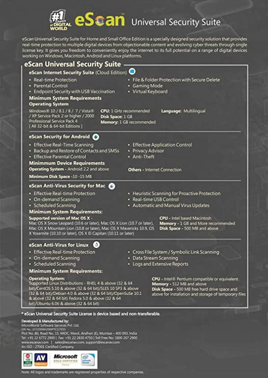 IOS (URL Scanning) – eScan's antivirus after scanning, displays the category of the scanned URL. In case it comes under the Malware category, then eScan highlights it in red System Requirements - Windows 10, Windows 8.1, Windows 8, Windows 7, [32 & 64-bits] Mac OS Snow Leopard, Lion, Mountain Lion, Mavericks, Yosemite, El Capitan, Sierra For Android 2.3 OS , Cyanogen OS [It will not run on ROOTED devices], Linux RHEL 4, CentOS, SLES 10 SP3, Debian, OpenSuSe, Fedora, Ubuntu, iOS 6.0 or later