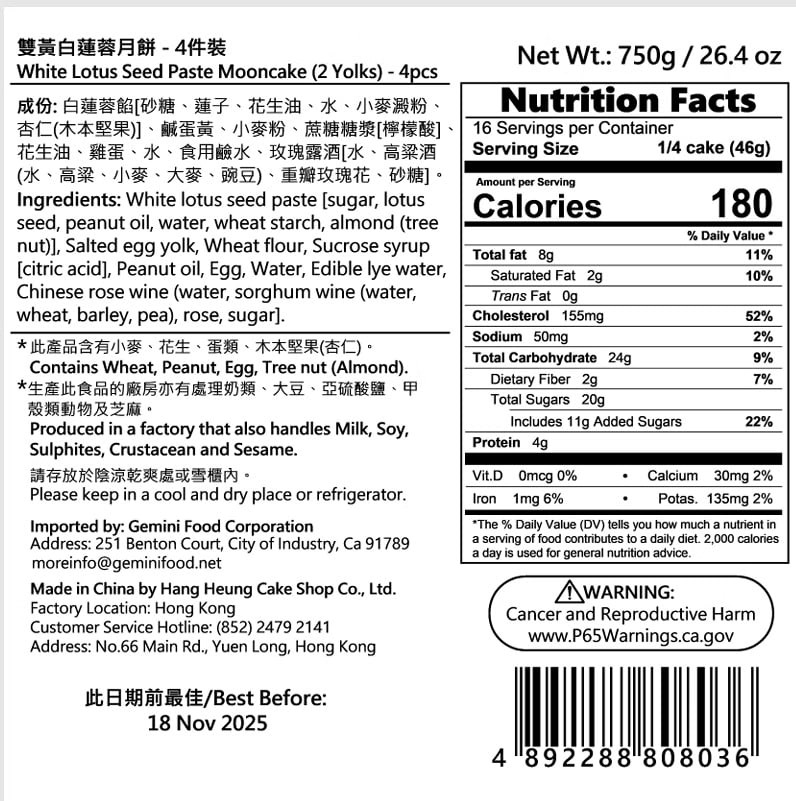 Hong Kong Hengxiang Double Yolk White Lotus Seed Paste Mooncake (4 pieces) [Time-honored Brand, Must-buy in Hong Kong]