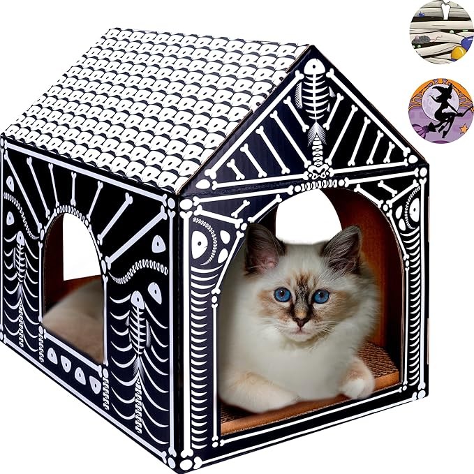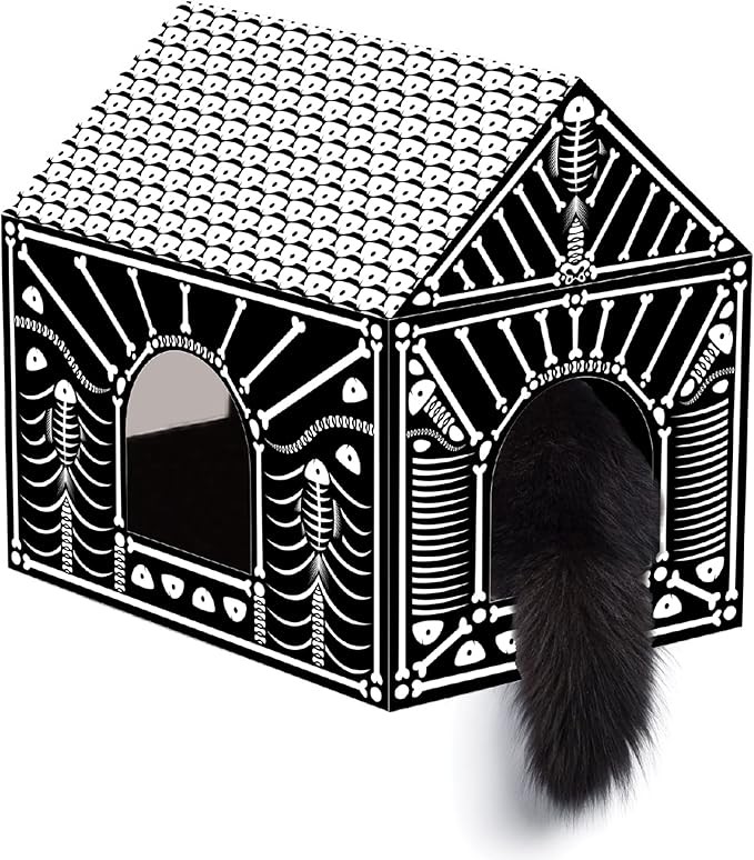 • [2 IN 1 DESIGN]: The Fish Bone Cat House is a cardboard cat house and scratcher all in one, with cozy and homey Halloween decorations that your cats could want on Halloween night. This multi-functional cat bed with cat scratcher provides your cat with a private hideaway to have fun in. The scratching pad keeps your furniture safe from claw damage and keeps claws trimmed. Go together with cat Halloween costumes!