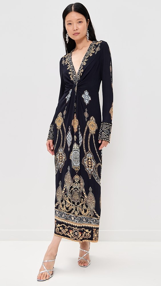 Long V Neck Twist Front Jersey Dress