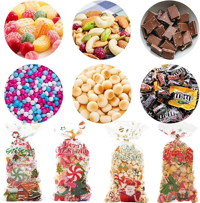 • Widely Application: These Christmas cellophane treat bags are Valentine's Day festival parties and daily use, which can storage candies, cookies, biscuits, chocolates and other small items, you can fill candies with these clear bags as a thoughtful gift for friends, kids, neighbors.