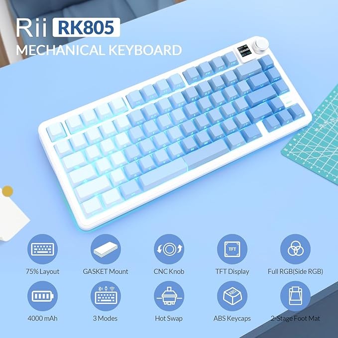 • 75% Mechanical Keyboard with Gasket Mount:The Rii RK805 utilizes a 75% compact layout and gasket mount construction. The gasket design features 4 layers of sound-absorbing foam, allowing the keyboard to effectively reduce noise, minimize noise interference, enhance sound quality, and enable full-key anti-ghosting, creating a comfortable typing experience for you. The keyboard color scheme adopts a unique visual scheme with gradient blue to bring you a novel experience