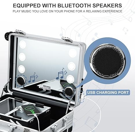 Rolling Makeup Case 22'' Cosmetic Organizer Case on Wheels with Full Screen Lighted Mirror Bluetooth Speaker Make up Artist Free Standing Box Makeup Vanity Station Aluminum Salon Case Silver
